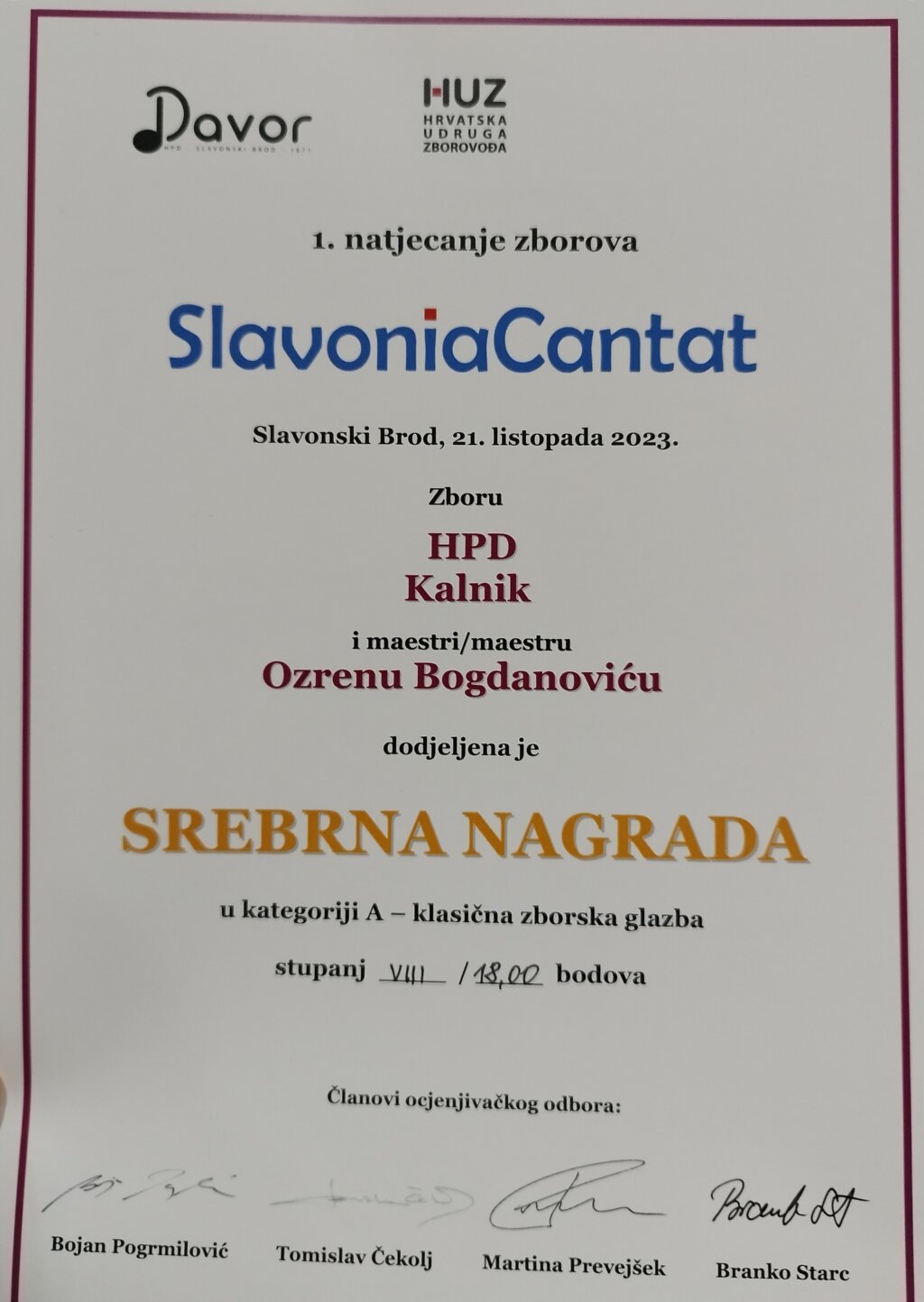 Hrvatsko pjevačko društvo „Kalnik” sudjelovalo je 21. listopada 2023. na 1. natjecanju Slavonia Cantat u Slavonskom Brodu, u organizaciji Hrvatske udruge zborovođa i osvojilo srebrnu nagradu osmoga stupnja, što je tik do zlatne plakete. Konkurencija je bila iznimno jaka, sudjelovalo je ukupno 19 zborova, klapa i sastava u četiri kategorije, od kojih su neki pjevali i u dvije.